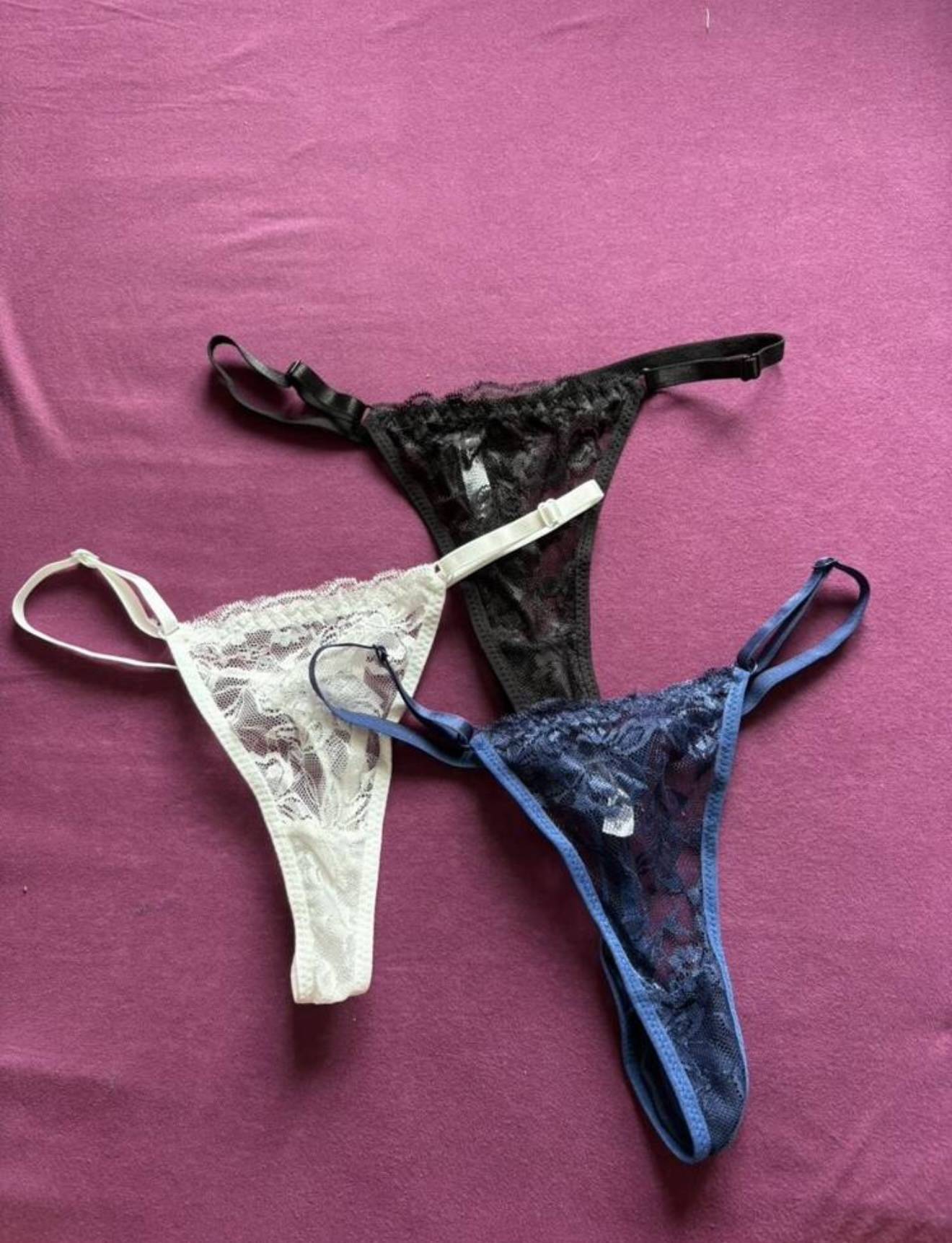 Zum Verkauf steht ein 3-teiliges Tanga-Set in den Farben Schwarz, Weiß und Blau – klassisch, bequem und feminin.