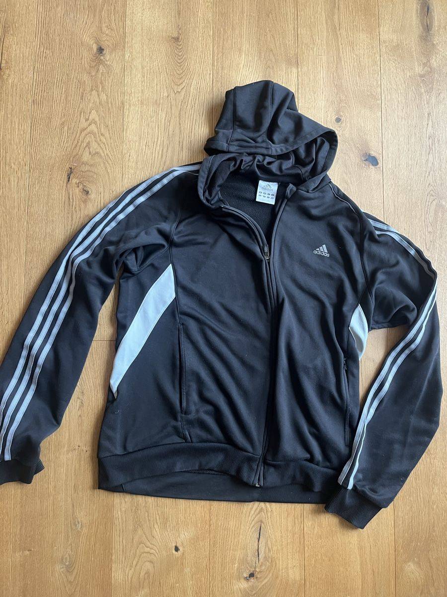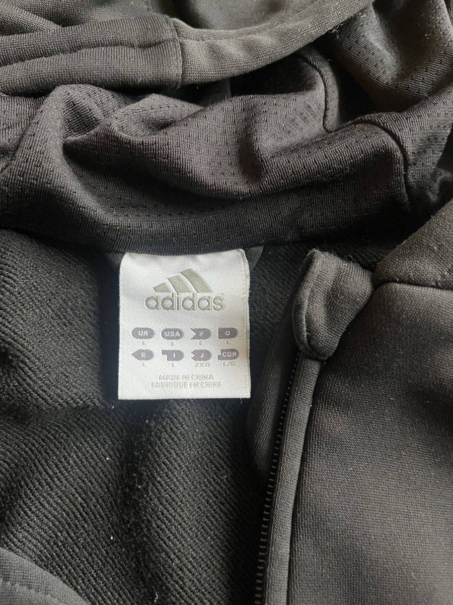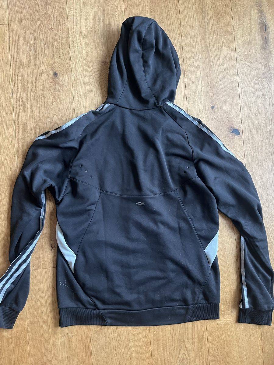 Verkaufe einen gebrauchten Adidas Kapuzenpullover für Herren in Grösse L. Der Pullover ist aus Polyester, Farbe Schwarz.