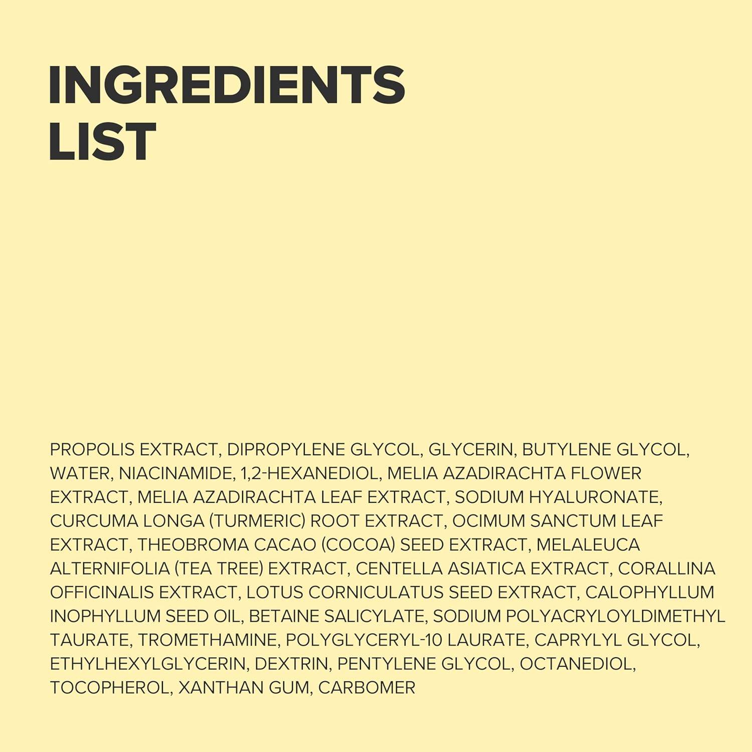• 1. 59,94 % Propolis-Extrakt, der reich an Inhaltsstoffen ist, hilft bei der Linderung von Hautproblemen, 2 % Niacinamid, das Hautprobleme durch Ausgleich von Öl und Feuchtigkeit reduziert, und 0,5 % Betainsalicylat helfen bei der Entfernung von Talg in den Poren.