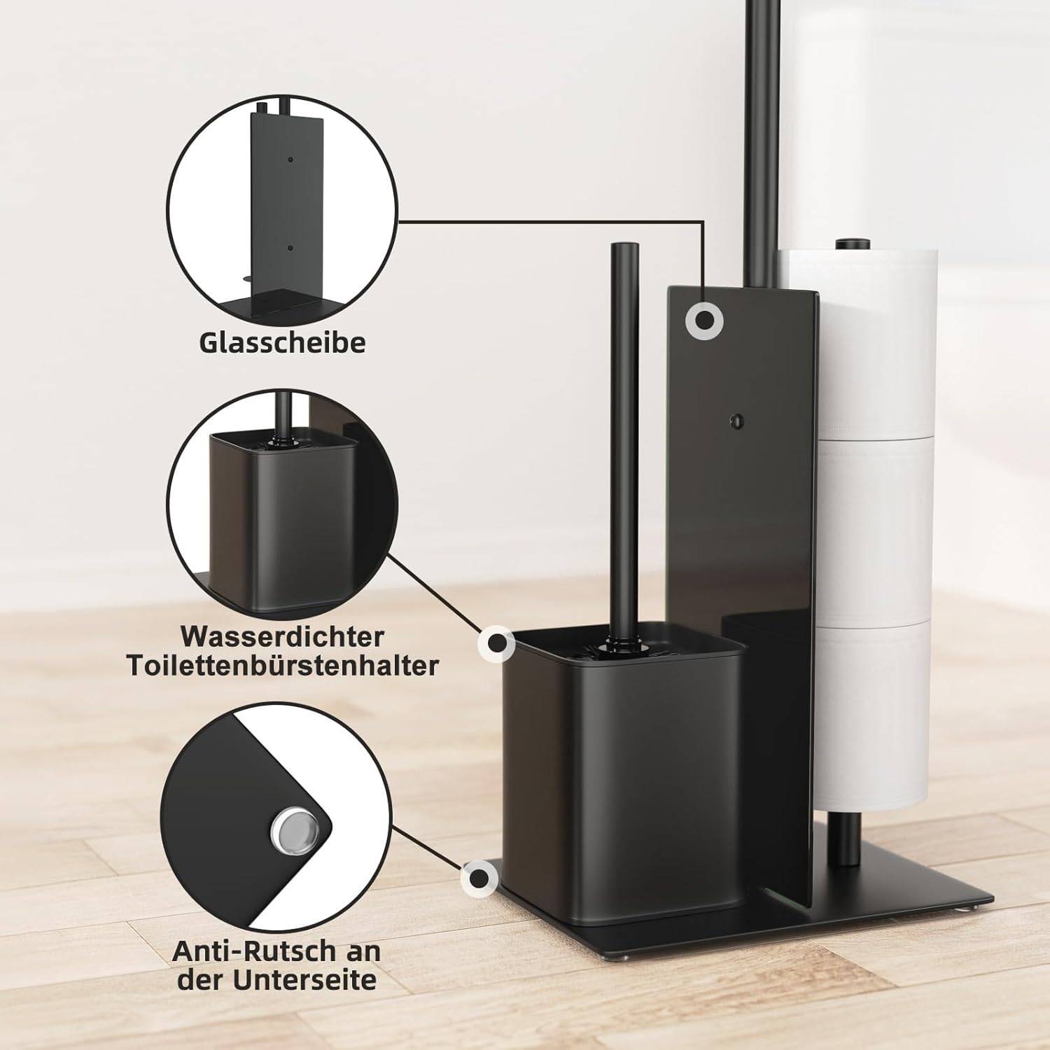 Edelstahl Klopapierhalter Stehend mit Klobürste - Toilettenpapierhalter mit WC Bürste, WC Garnitur mit Toilettenpapierhalter und Toilettenbürste, Klorollenhalter Stehend mit Glasregal (Schwarz Matt)
