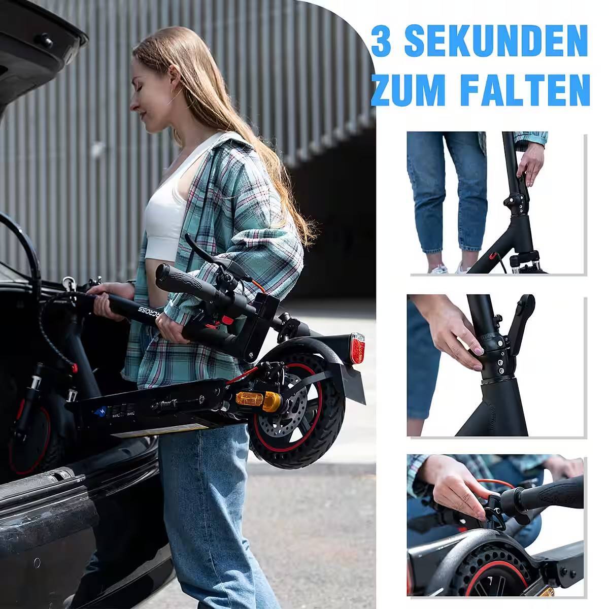 - Faltbarer E Scooter: Der E-Scooter kann zum einfachen Tragen zusammengeklappt werden.