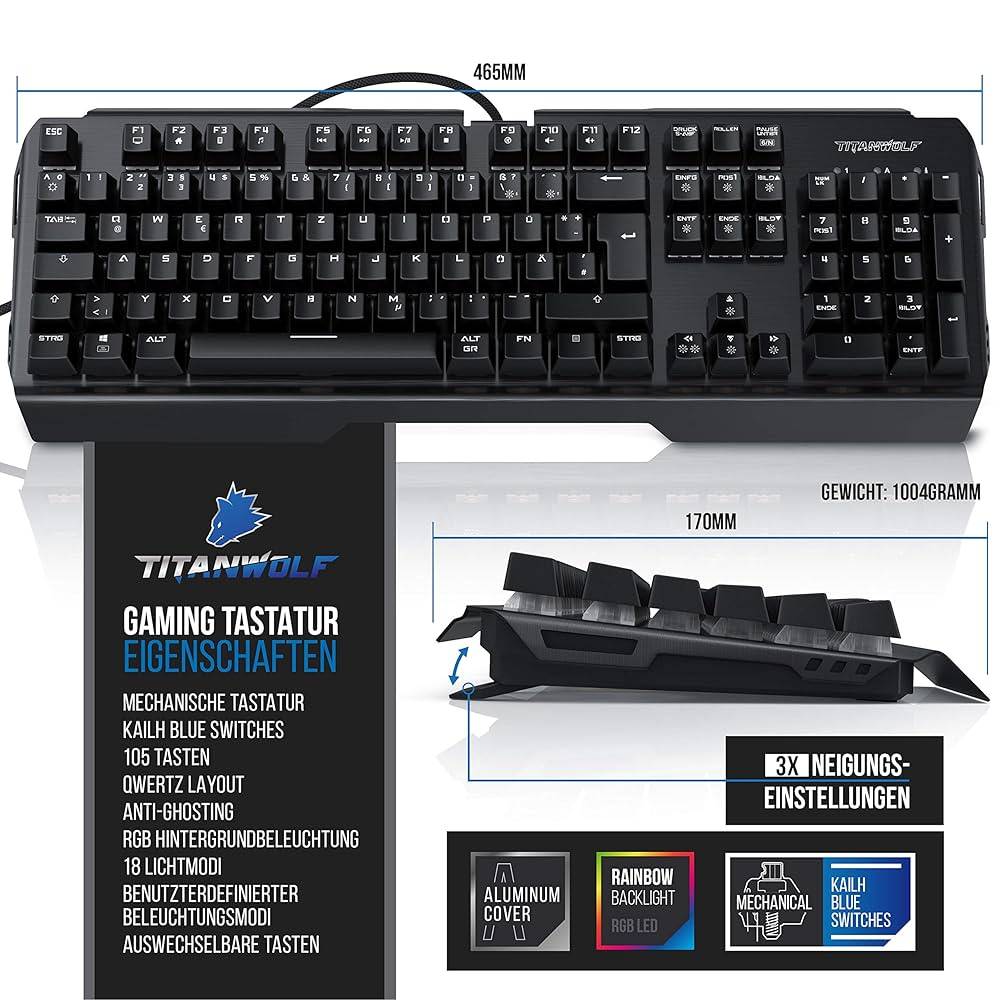 - Die Titanwolf ALUMAR Tastatur ist ein Statement: exzellent verarbeitet, mit einer Trägerplatte aus Aluminium und ausgestattet mit hochpräzisen, mechanischen Tasten von Kailh Blue. Die vielen Lichtmodi sehen nicht nur klasse aus: Dank der frei konfigurierbaren Beleuchtung kannst Du wichtige Tasten optisch hervorheben und erfasst sie beim Spielen mit einem Blick. Ihre Qualität hebt die ALUMAR aus der Menge heraus, und die Features machen sie zur perfekten Steuerzentrale Deiner Gaming-Wettkämpfe.